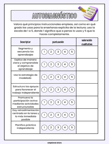 Valora qué principios instruccionales empleas, así como en qué grado los usas para la enseñanza explícita de la lectura. Tomando como referencia la imagen adjunta (Autodiagnóstico) completa el documento adjunto con una valoración cuantitativa (usa la escala de 1 a 5, donde 1 significa que apenas lo usas y 5 que lo haces completamente) y cualitativa de cada uno de los descriptores.