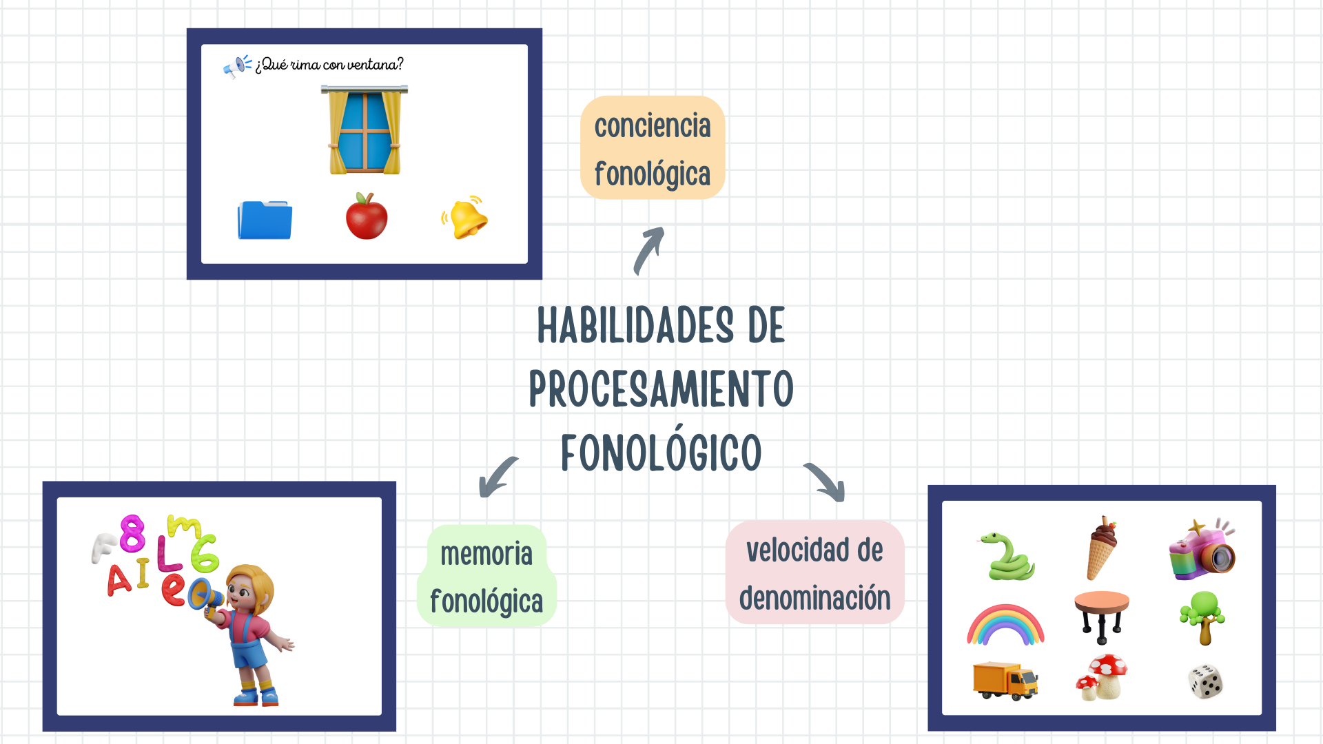 La conciencia fonológica, entendida como la capacidad de reflexionar y manipular los sonidos del habla, constituye uno de los pilares fundamentales en la adquisición de la lectoescritura (Goswami y Bryant, 1990). Por su parte, el conocimiento alfabético, que abarca el reconocimiento de letras y la comprensión de las relaciones grafema-fonema, es esencial para establecer conexiones entre el lenguaje oral y el escrito (Ehri, 2005). Finalmente, el desarrollo del lenguaje oral, incluyendo el vocabulario y las habilidades narrativas, no solo favorece la comprensión lectora, sino que también potencia el acceso al significado de las palabras escritas (Dickinson y Tabors, 2001; Biemiller, 2003).
