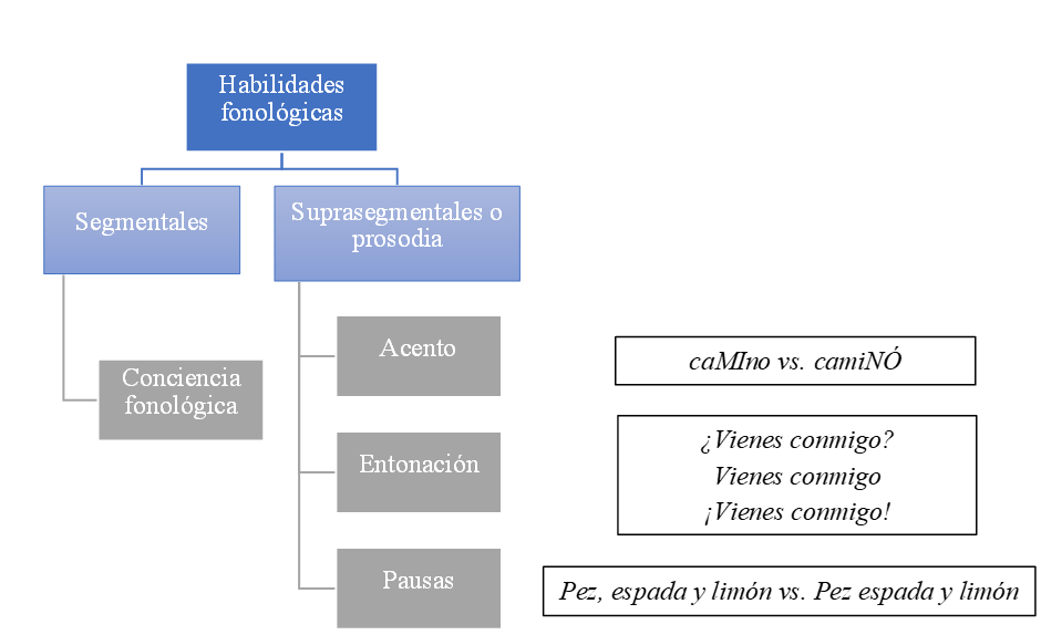 Por otro lado, se encuentra la fonología suprasegmental, también conocida como «prosodia» o «melodía del lenguaje». Se refiere a aspectos más amplios del habla, como el acento, la entonación y las pausas (Holliman et al., 2014). Contar con buenas habilidades de fonología suprasegmental también influye en el aprendizaje de la lectura, puesto que leer correctamente no implica solo conocer la relación entre los sonidos y sus letras, sino también aplicar el acento adecuado, emplear la entonación apropiada y respetar las pausas. Estas habilidades nos permiten, por ejemplo, distinguir entre «camino» y «caminó» o diferenciar entre dos o tres elementos en las frases: «balón, cesto y pera» y «baloncesto y pera».