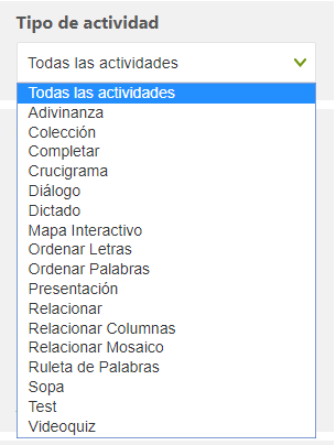 Por ejemplo, para filtrar actividades por tipo, desplegamos la lista correspondiente para seleccionar la que interese: