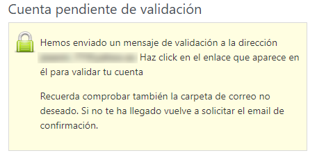 Al completar el registro, aparecerá un aviso para recordarte que debes validar la cuenta haciendo clic en el enlace del mensaje que recibirás en la dirección de correo que hayas indicado: